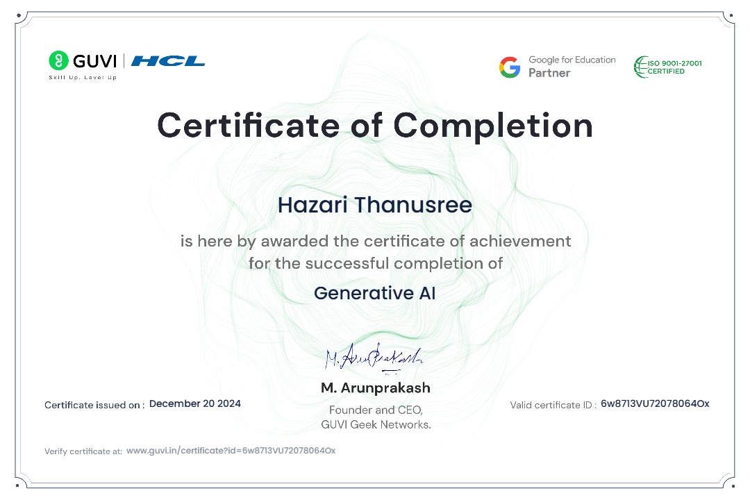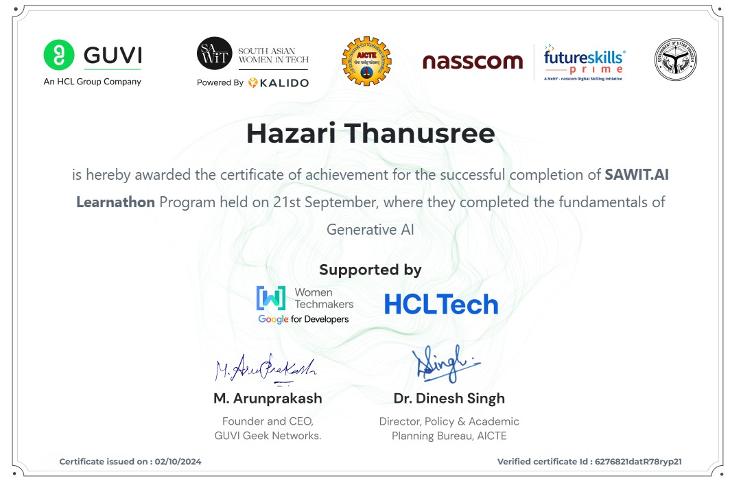 Completed the course on Generative AI, gaining expertise in AI concepts and applications.